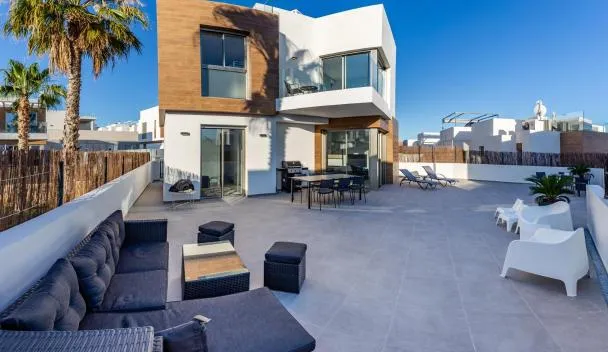 Set in Orihuela Costa, Penthouse met exclusief dakterras Casa Buena Vida Orihuela Costa offers a patio with pool and garden views, as well as a year-round outdoor pool, fitness room and solarium.