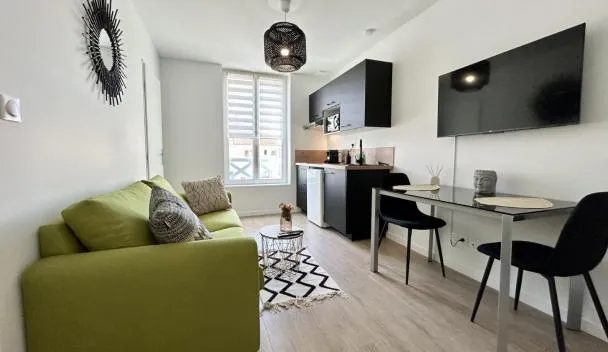 ノール=パ・ド・カレー地域圏のベルク・シュル・メールにあるjolie logement proche de la merはバルコニーを提供しています。ドビンビーチから徒歩8分で、コンシェルジュサービスを提供しています。 ベッドルーム1室、衛星薄型テレビ、ダイニングエリア、キッチン、リビングルームが備わるアパートメントです。