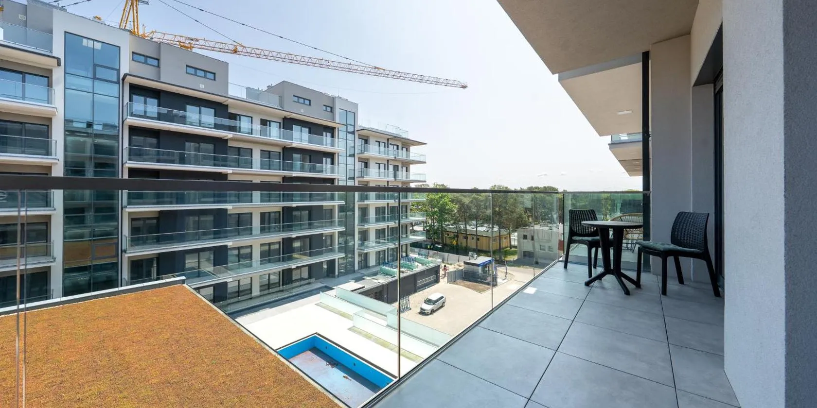 市街の景色を望むPrestiżowy Apartament Baltic Sand 300 m od Plaży Mrzeżyno by Noclegi Rentersはテラスとバルコニーを提供する宿泊施設で、ムジェジノ・フスフッドビーチまで約徒歩3分です。このアパートメントでは、無料専用駐車場、24時間対応のフロント、無料WiFiを提供しています。