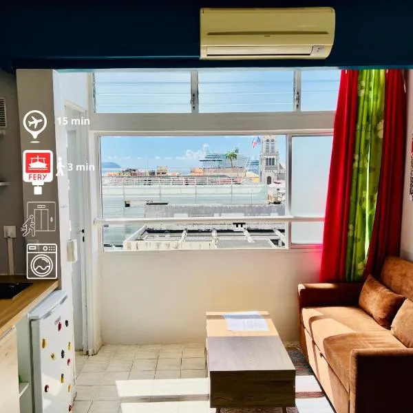 市街の景色を望むEbène - F1 au coeur de Fort-de-Franceはフォール・ド・フランスにあり、ラ・フランセーズビーチまで約徒歩8分です。無料WiFiを提供しており、専用駐車場(有料)を手配できます。 ベッドルーム1室、衛星薄型テレビ、キッチン(冷蔵庫、電子レンジ付)が備わるエアコン付きのアパートメントです。このアパートメントにはタオルとベッドリネンを用意しています。