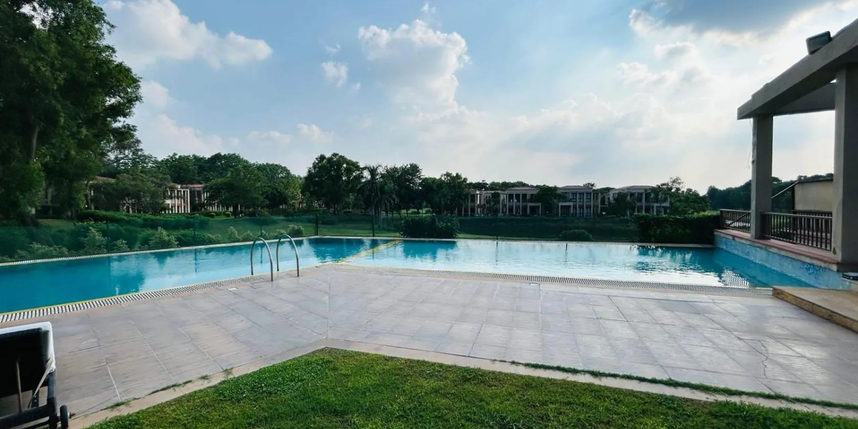 Offrant une vue sur la piscine, l’hébergement Elivaas 5 BHK with Pool, Tents & Pond - Kaimalgarh Farmstay propose une piscine extérieure et un balcon, à environ 15 km de ce lieu d’intérêt : WorldMark...