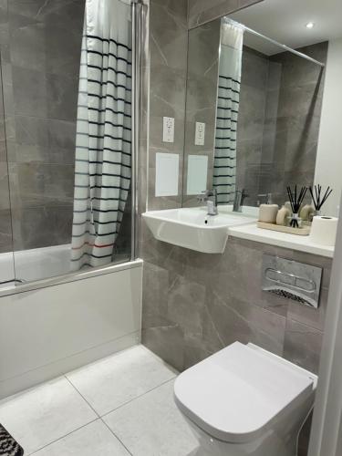 Stylish Luxury New Built Apartmentはダゲナムにある宿泊施設で、バーキングまで7.9km、アップミンスターまで10km、イースト・ハムまで11kmです。この宿泊施設では、バルコニー、無料専用駐車場、無料WiFiを提供しています。