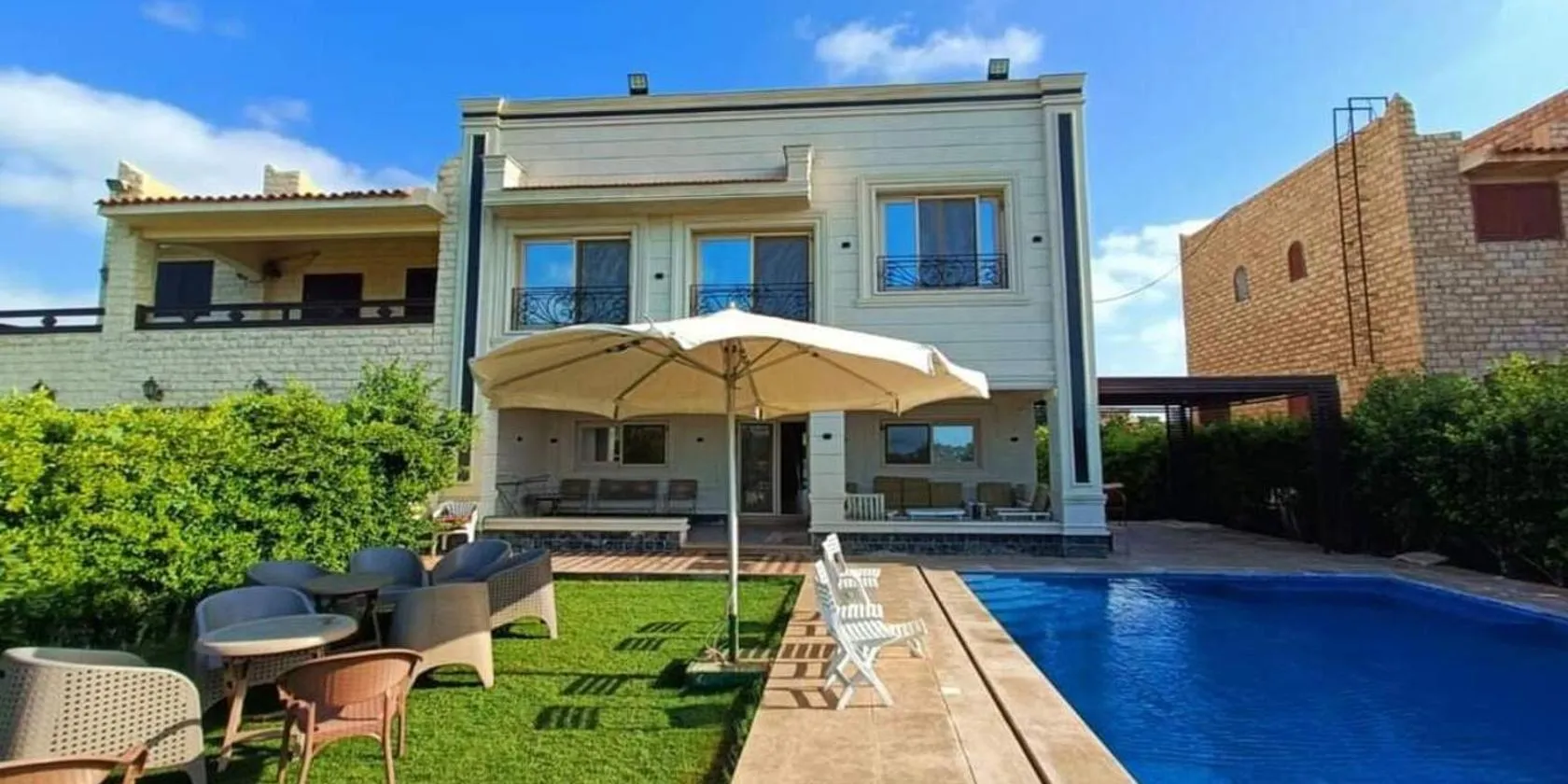 エル・アラメインにあるفيلا اول صف بحر مارينا الساحل الشمالي العلمين برايفت بولは、庭の景色を望むユニット(専用プール、バルコニー付)を提供しています。ビーチフロントにある宿泊施設で、庭とテラスを提供しています。...